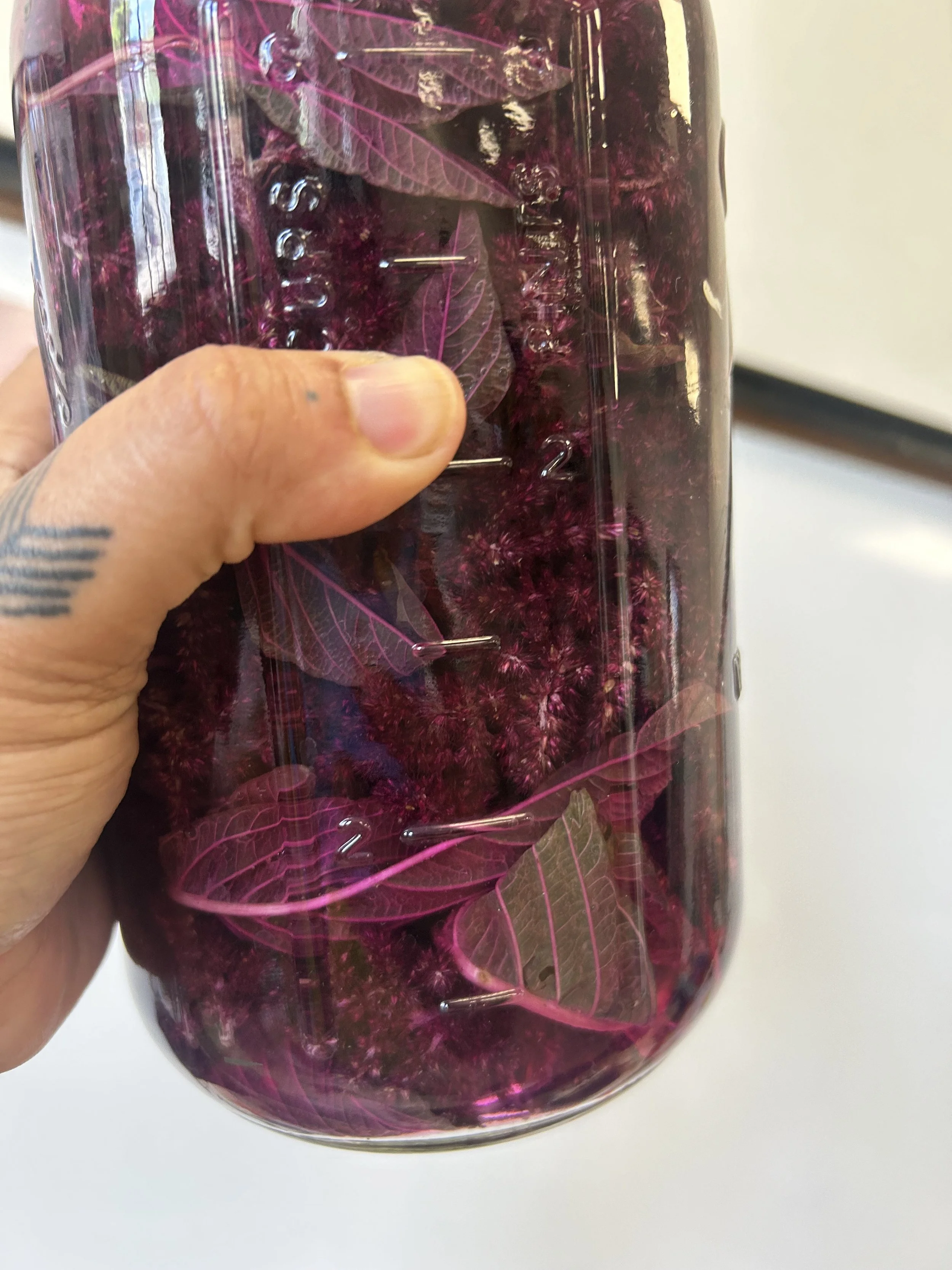 I left it overnight, and the color is extracting and is beautiful. I am concerned about my water to plant matter ratio, BUT I followed the steps we used during my residency, and only used enough to cover the flowers. My concern is that the liquid will be too saturated and won’t fully extract. I also, think I should’ve heated the water first to get it to go more quickly. I’m nervous to leave it another day, because I don’t want it to turn brown. I might also leave it until later this afternoon, and then remove some, and add new water, so I can experiment with temperature and not lose the dye that came out today.