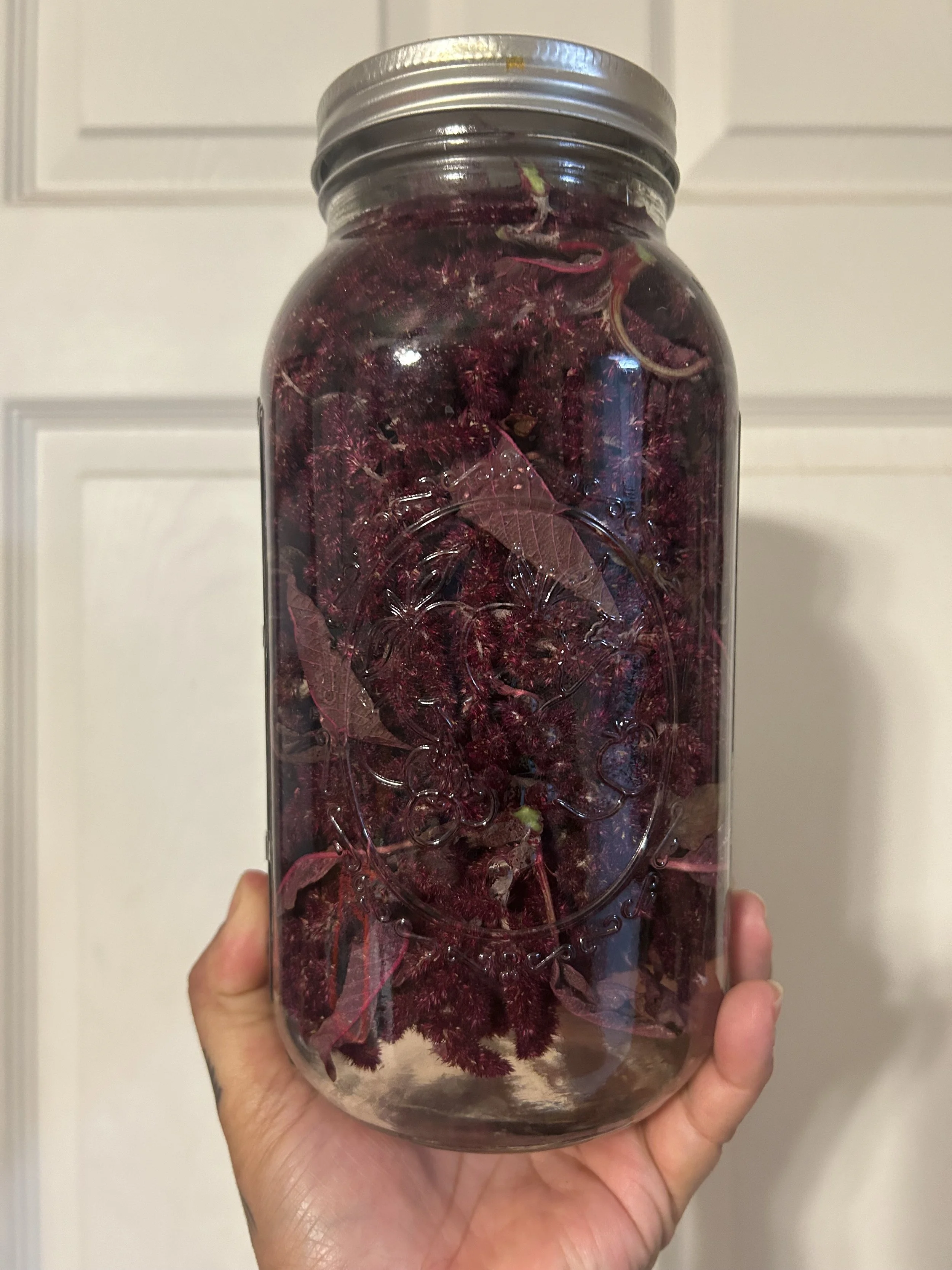 I have a long standing fued with using red amaranth for dye. It’s been completely unsuccessful. I have tried for about 4 or 5 years to produce a dye with amaranth. The first couple years I only got beiges. They did; however, make some beautiful eco prints. I also noticed that when there’s too many leaves the color is also beige. So it seems the flowers are key. Last year I was successful in getting pink dye, but then I accidentally left the fibers too long in the dye and the color seeped out and turned beige again. I had vowed, never again, especially considering it’s not a long lasting dye. It fades over time. BUT I know it’s one of the indigenous dyes for my area, and that there must be ways to use it successfully. Anyways. It continues to volunteer itself in the garden so I will continue to try to use it.
