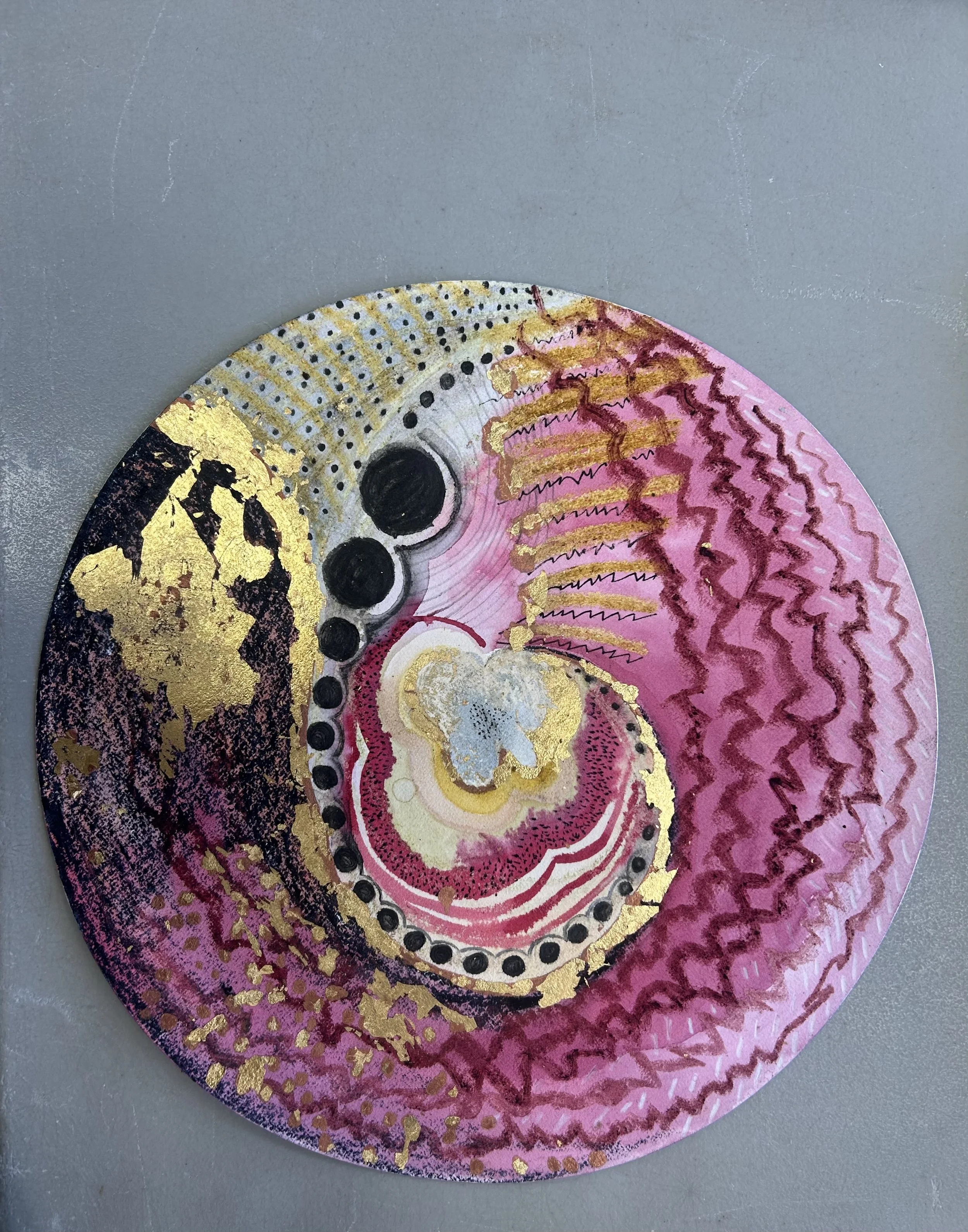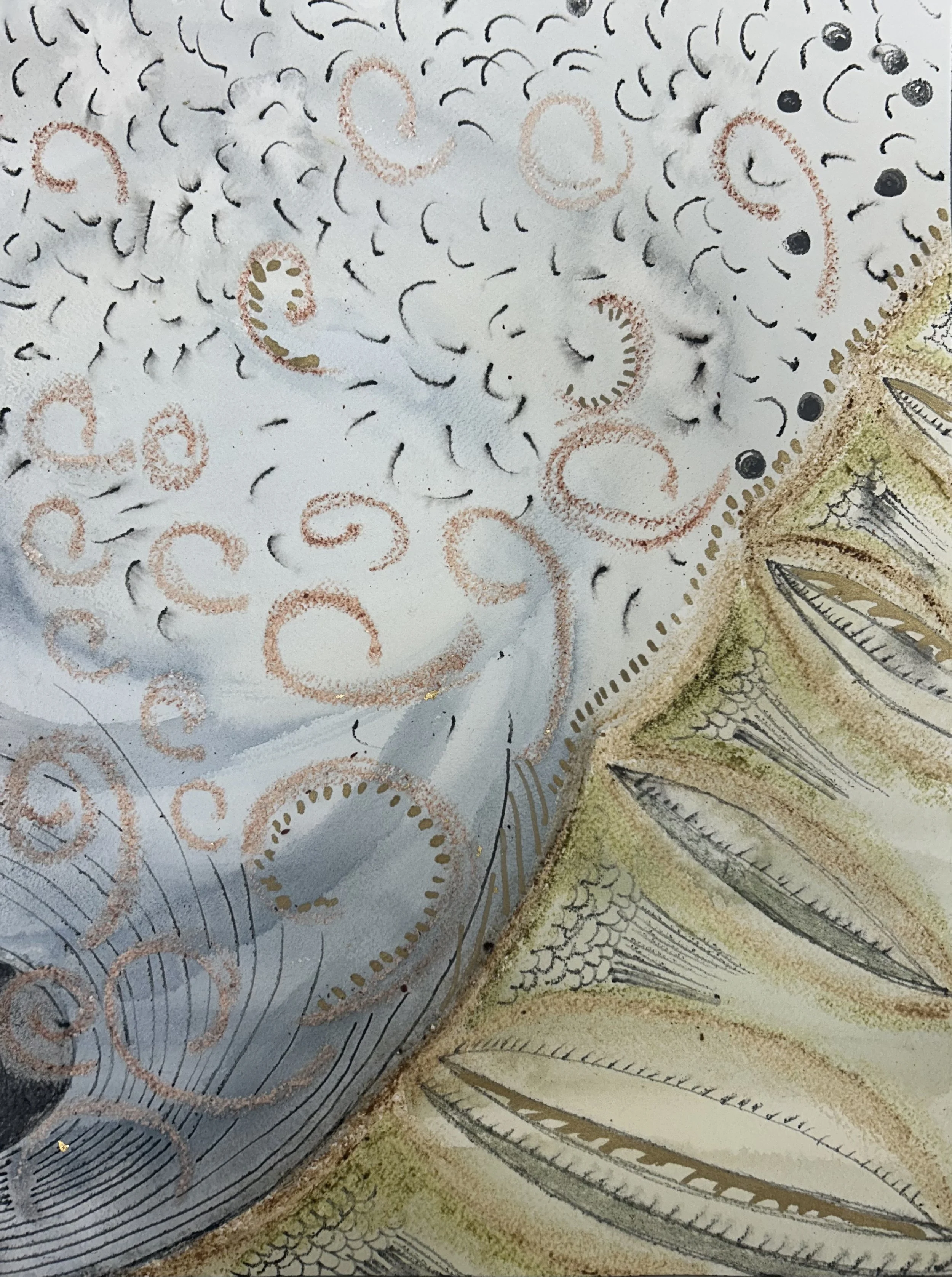Natural pigment watercolor, natural pigment oil pastel, charcoal, graphite, ink, and gold leaf on cotton