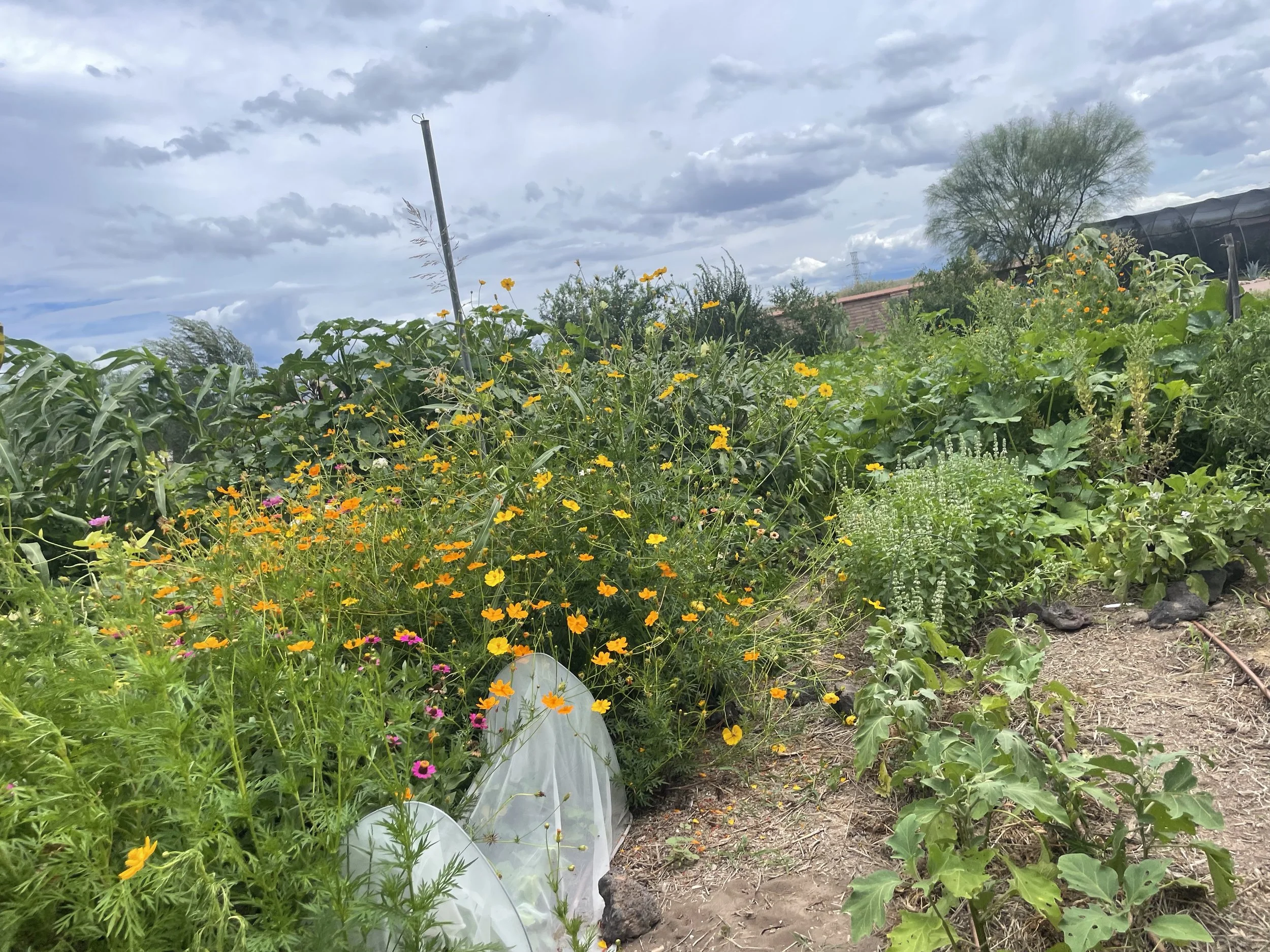 The African American garden (There are several gardens dedicated to the food history and cultures of Tucson, showing the foods that were here and which were brought and by whom.) was sooo lush and full. There was three okra varieties (courtesy of seeds bought from us), basil, eggplant, moringa, squash, melons, sorghum, millet, and flowers. I’m sure there was more, but those are the things I remember off the top of my head. There was also a chicken hutch, which the toddler found to be exciting. That’s also one of the things she loves to visit at the garden we grow at.